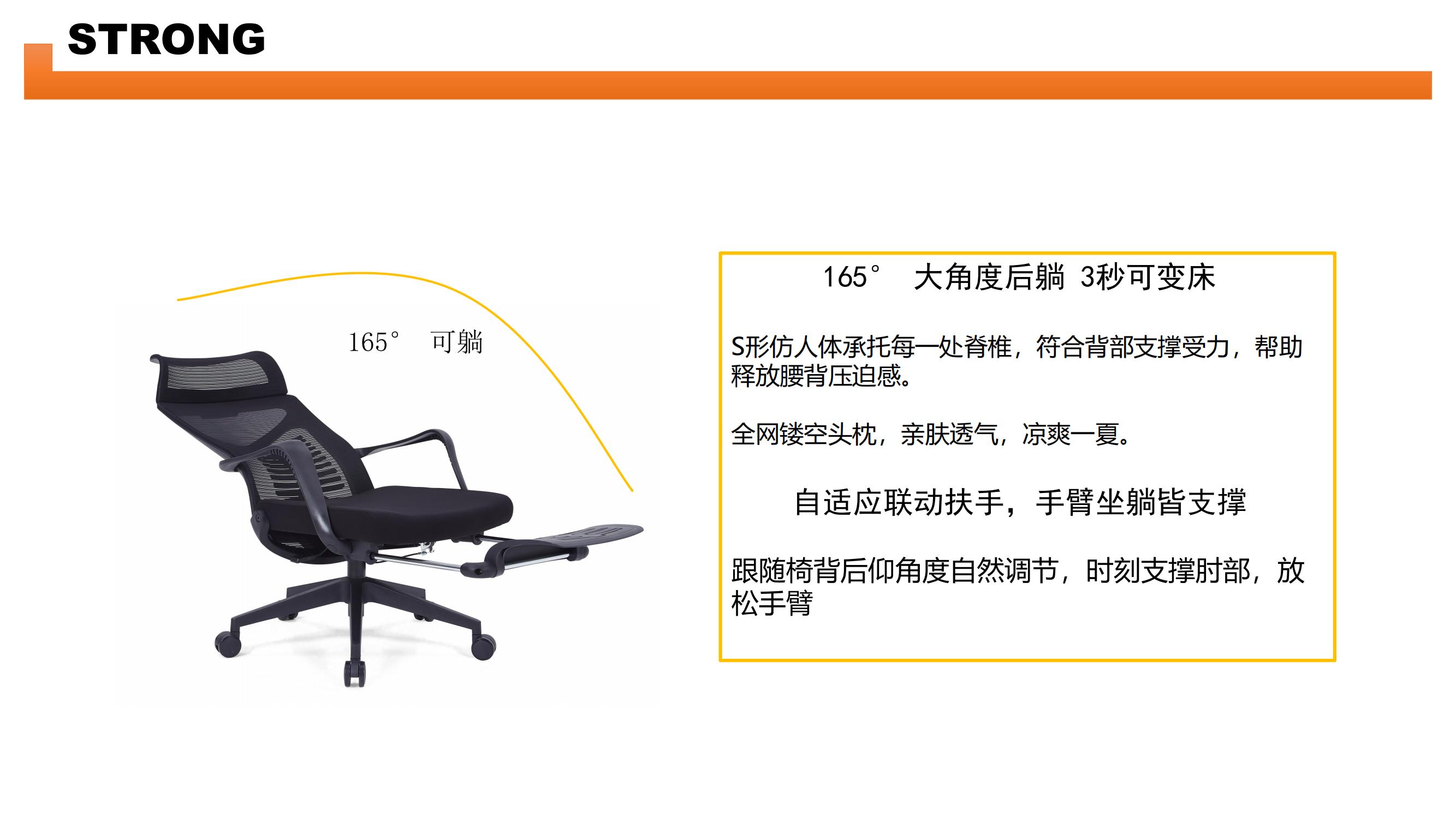 165° 大角度后躺 3秒可变床 S形仿人体承托每一处脊椎,符合背部支撑受力,帮助释放腰背压迫感。 全网镂空头枕,亲肤透气,凉爽一夏。 自适应联动扶手,手臂坐躺皆支撑 跟随椅背后仰角度自然调节,时刻支撑肘部,放松手臂