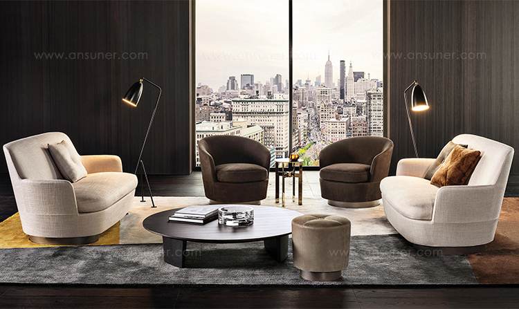 底座可以旋转的Jacques沙发拥有柔软的坐垫和靠背,带来绝佳的舒适感,尤其适合打造休闲放松的空间,可以搭配Song边几和脚凳,达到相得益彰的效果,边几不仅可以用来放置台灯,也可以用来放置各种小物件。
