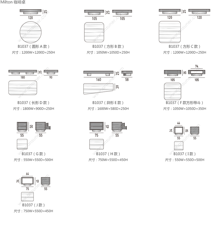 Milton 咖啡桌 系列尺寸/示意图