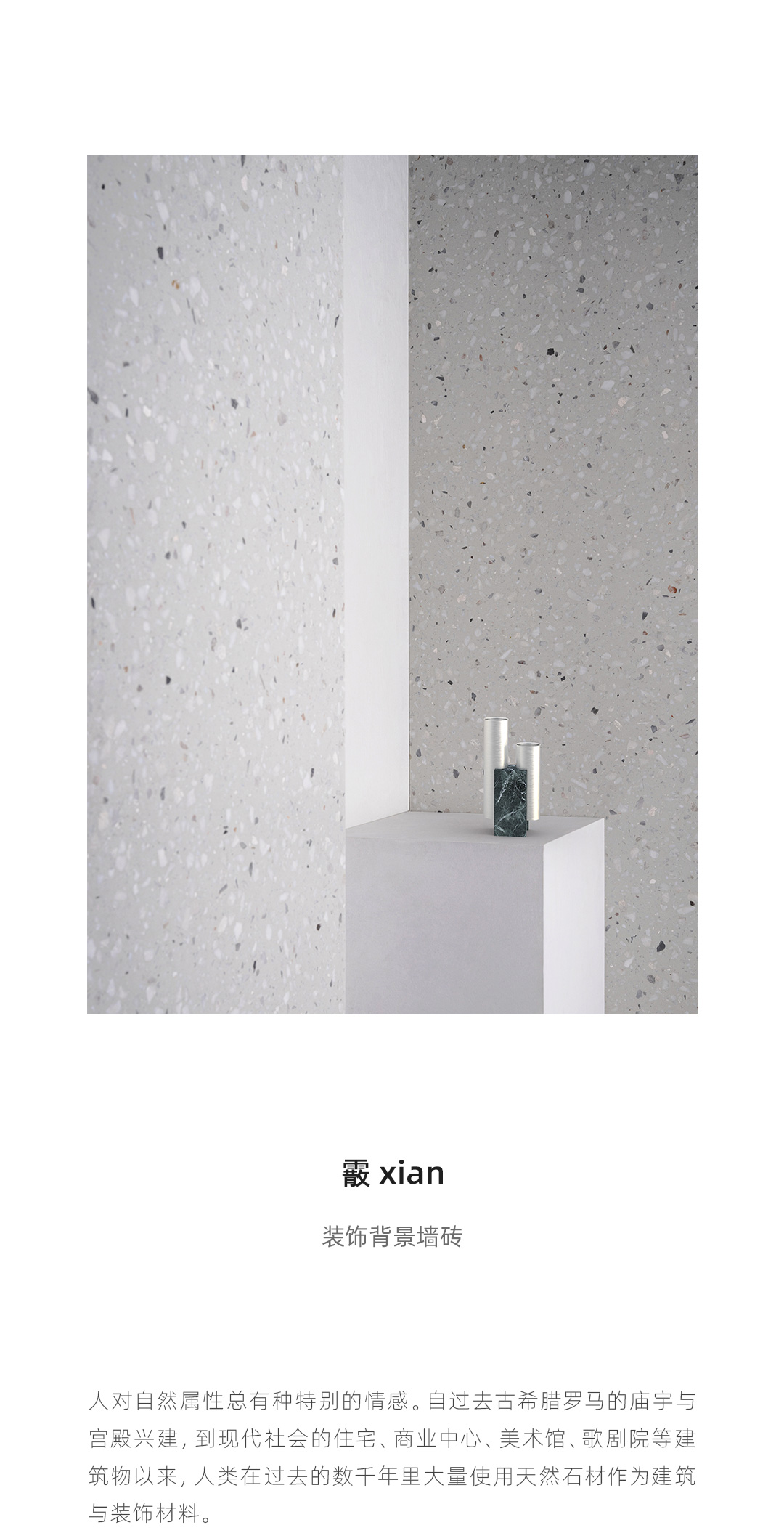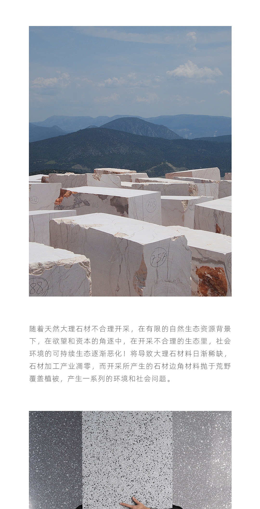 随着天然大理石材不合理开采,社会环境的可持续生态逐渐恶化! 然而人类对天然物质有着不可磨灭的向往和追求,而开采的过程中留下大量的石材的边角料,再利用边角料与混凝土预制搅拌,经过表面打磨抛光做成水磨石装饰板材,这可能是天然石材的挽歌,也是作为地球公民对社会自然生态可持续发展作出的一些探索。
