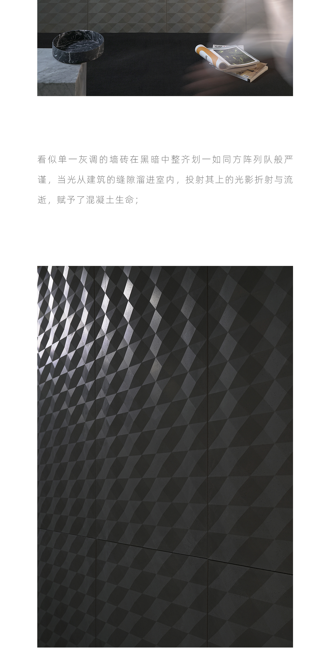 看似单一灰调的墙砖在黑暗中整齐划一如同方针队列般严谨,当光从建筑的缝隙溜进室内,投射其上的光影折射与流逝,赋予了混凝土生命。