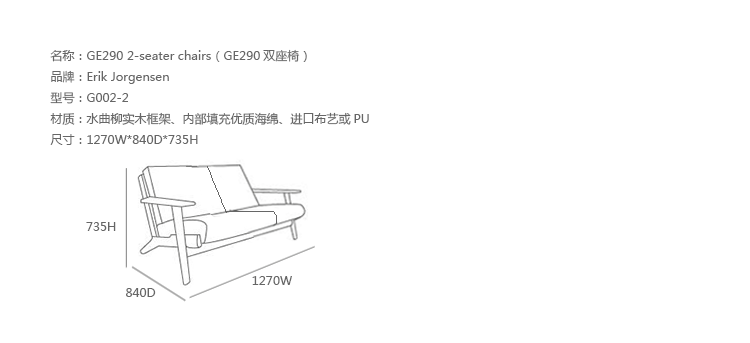 GE290系列座椅由丹麦设计大师Hans Jørgensen Wegner所设计。身为丹麦四大巨匠的Hans Wegner,是丹麦最知名、影响力最大的设计师之一,「全世界最美丽的椅子」正是出自他手,他的作品不仅常被冠上「不朽」、「永恒」等美誉,更是世界各地设计博物馆必备馆藏之一,而「椅子的大师」、「20 世纪最伟大的家具设计师」则是最常加诸在他身上的光环。GE290系列座椅拥有着自然、田园风格而且很容易搭配现代风格居室的家居用品,宽大平板扶手是特点,沙发坐垫柔软而且厚重,色彩丰富,可以用于休闲、休息时的躺椅,沙发的实木框架处理的光滑,触感舒适,从1960年到现在,GE290系列座椅已经历经了半个多世纪,也成了艺术博物馆收藏品之一,为后来的设计师提供了参考和借鉴,给家具行业添上了一个完美的音符。