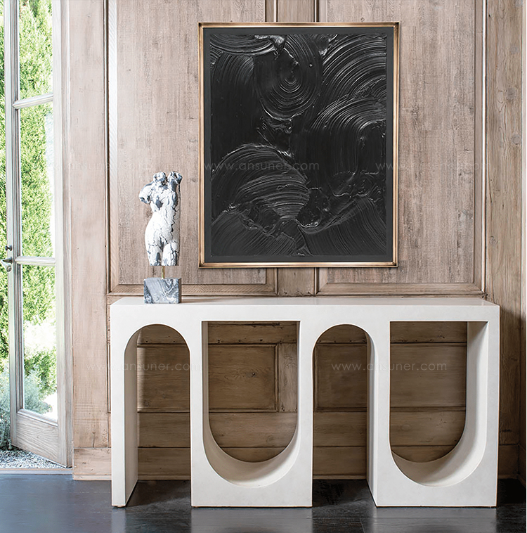 Roxbury玄关台采用实心树脂铸造,手工抹平石膏饰面,具有图形轮廓。 交替的拱形形成了这个独特的玄关台的形状,创造了空间几何和颜色的美丽调制。