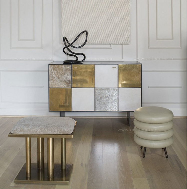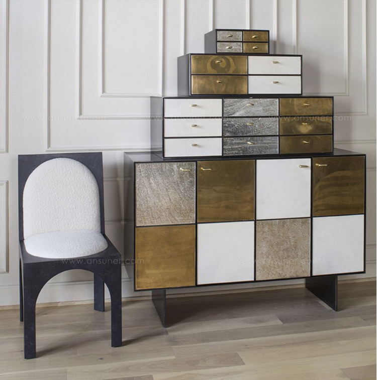 Huntley Cabinet(亨特利柜)是由黑色不锈钢机身和美丽的美国胡桃木内饰组成。在操作台部分的四扇门后面,一个可移动的内部搁架显露出来,而堆叠的金字塔形状以传统燕尾滑动抽屉为特色。 白色羊皮纸,手工制作的透明种子玻璃,古董镜子和抛光青铜,抽屉和门前面交替,全部装饰有手工雕刻的拉链。