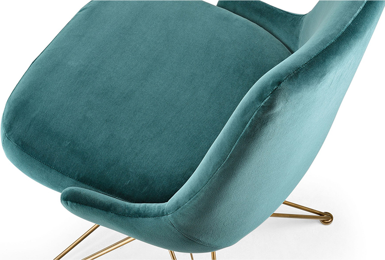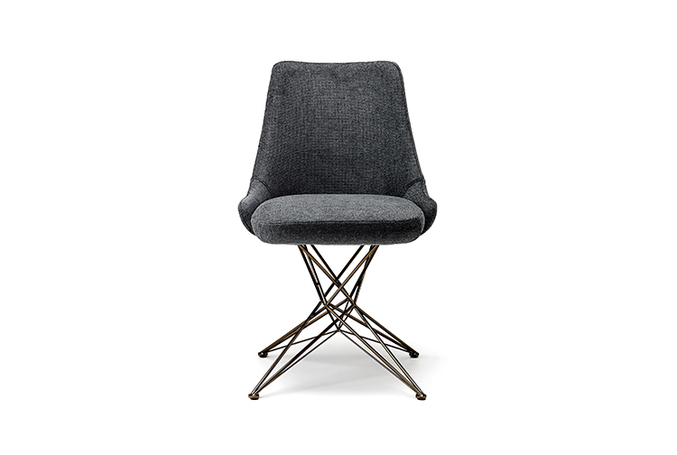 由金属丝制成的轻盈而立体腿部与座椅靠背的结构形成对比,从而在形状和体积之间营造出一种和谐的平衡效果。座椅靠背略微弯曲,将座椅的衬垫包裹起来,以符合人体工程学和动态舒适性。