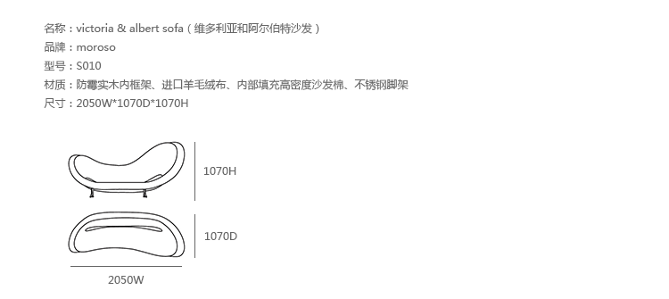 victoria & albert sofa(维多利亚和阿尔伯特沙发)系列提出一种创新,但舒适和舒适的设计,设计者是以色列著名设计师Ron Arad。设计造型为两张扶手椅伴着一个沙发,能够调解的设计和功能相结合的研究和技术保证舒适和舒适的地方休息。取名是为了向对伦敦著名的"Victoria & Albert"博物馆致敬。被誉为 20 世纪最重要的设计师之一,Ron Arad 出生在特拉维夫,在搬去伦敦前,就学于耶路撒冷艺术学院,在建筑电讯派创始人彼得·库克下学习设计。Ron Arad 成功地建立了独特的设计风格,使用的材料和概念的非正统组合。制作采用防霉实木内框架、进口羊毛绒布、内部填充高密度沙发棉、不锈钢脚架。