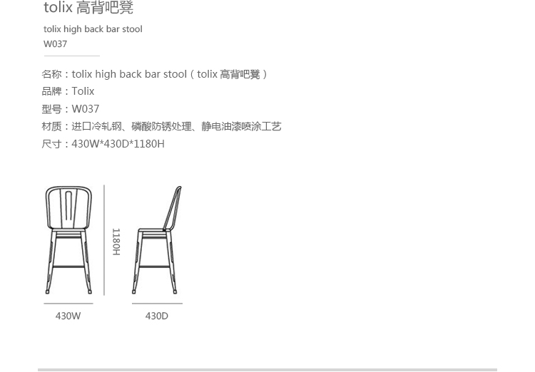 tolix chair(tolix椅)一把有味道、有态度的椅子,据说它最开始被使用在一艘战舰的天气预报房间里,故事的真实性与否不得而知,但是不影响其成为享誉世界的著名设计家具,1934年由Xavier Pauchard设计,早期是作为户外用家具设计,力图展现法式慵懒而闲适的气质,经年而来被全世界时尚设计师所宠爱,从室外扩展到家居、商业、展示等多个用途,而此椅也不负众望在各类空间中均有上佳表现,特别是近年来与混搭、乡村、美式、怀旧、北欧简约、中式等主要装修风格搭配,都呈现出独特的韵味,也被时尚界赞为“百搭第一”椅,可以用在酒吧,餐馆,咖啡馆等等地方,之后通过改进,设计出有扶手版本的tolix armchair(tolix扶手椅),高背版本的tolix high back bar stool(tolix高背吧凳),宽背版本的tolix wide back bar stool(tolix宽背吧凳),及tolix bar stool(tolix吧凳)和tolix mini stool(tolix迷你凳)。制作采用进口冷轧钢、磷酸防锈处理、静电油漆喷涂工艺、坐面为木板或PU海绵坐垫,颜色可选。