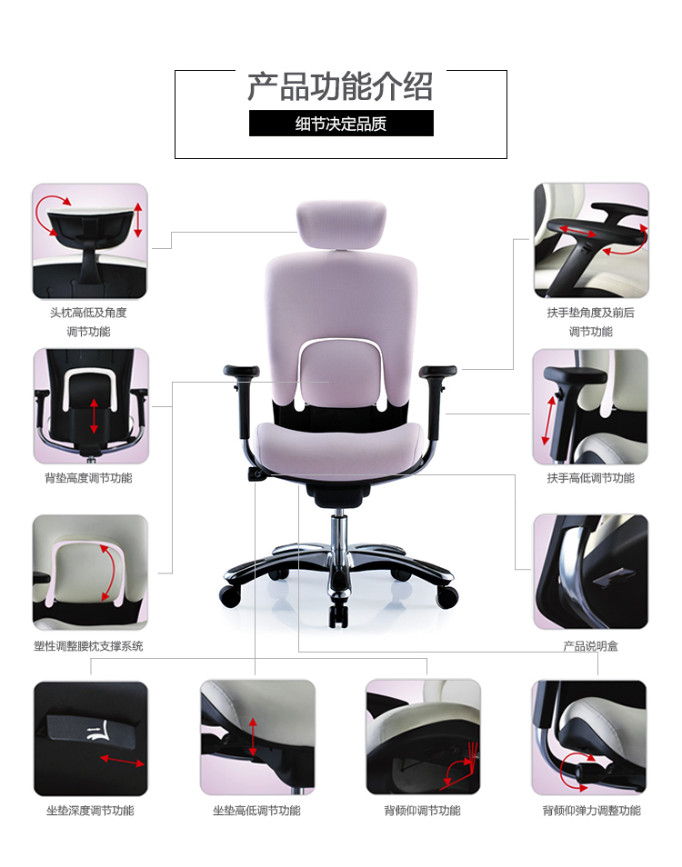 金爵系列采用独特的分离式腰枕设计,并使用塑胶的特性达成调整的功能,提供使用者最佳的腰部支撑;