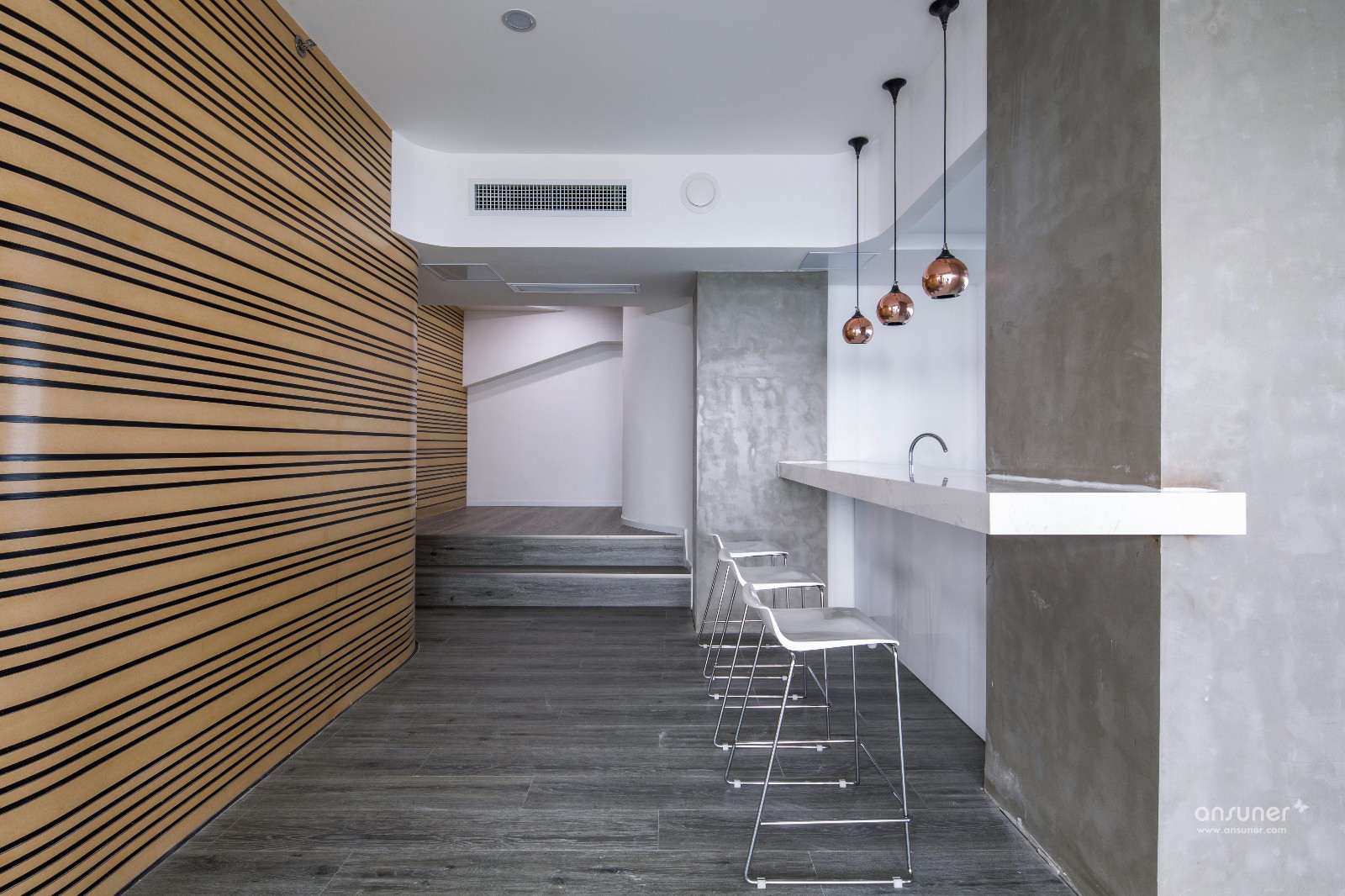 甲方最终敲定南京苏宁慧谷中心。新的办公室由5套50-70㎡不等的loft户型组合而成,一乘二的形式可以轻松获得双倍的办公面积。这也是Loft户型优点的最大体现,叠加赋予空间更强的可塑性,同时也带来层高相对局促的弊病,本案亦是如此。作为一家集产品研发、集成、销售、服务于一体的科技通信公司,业主提出了众多非常规的功能要求,如设立仓库、维修室、实验室、工具间等。这些相对独立的空间需要在布局中优化考虑,以确保实验、办公、出货的高效进行,同时还要克服空间的开阔性不够带来的采光不足等问题。如何将5套loft打通的狭长空间规划得有声有色,既满足功能需求又贴切公司的企业形象?这是设计师面临的主要问题。在此我们大胆运用了弧形线条作为主要设计元素,这样可以更加有效的对空间进行自由分割,同时打破办公室横平竖直、千篇一律的常态。从空间的布置分割到墙面的密集装饰线条,乃至楼梯的造型。曲形线、面无处不在。自由延伸的线条令人不禁遐想到无限蔓延的电波,更给人动态流畅的视觉感受。