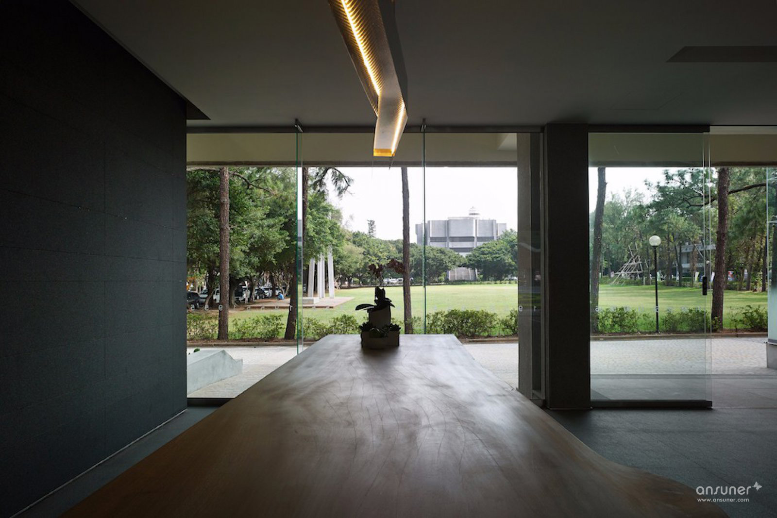 轴长条形的建筑物,循着梁柱结构的痕迹勾勒出长短两向轴线。短向轴线连结前后绿带草坪,长向轴线使左右两侧空间遥望对话。